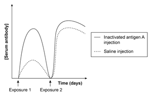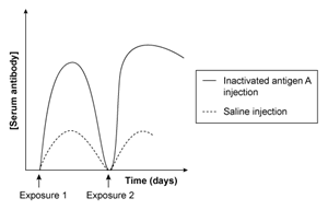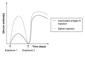 In a drug trial, one patient receives an injection containing inactivated antigen A and another patient receives a saline injection. The immune system can mount a response against inactive antigen A. If each patient was exposed to antigen A twice after receiving the initial injection, which of the following graphs shows the expected changes in the levels of serum antibodies against antigen A across time?