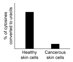 B) ![Passage Proteins known as cancer/testis antigens (CTAs) are normally expressed exclusively in germline cells but may become reactivated in cancer cells due to chromatin remodeling (eg, gene activation due to DNA demethylation) . Because of their normally restricted expression, CTAs can elicit an immune response when expressed by cancer cells derived from other tissue types. Several CTAs are known to inhibit apoptosis or promote cell division in cancer cells, making them more resistant to traditional chemotherapy. Accordingly, cancer research instead has focused on immunotherapy treatments targeting CTAs.In a study, researchers isolated peripheral blood lymphocytes (B lymphocytes, T lymphocytes, natural killer [NK] cells) from two healthy individuals. These lymphocytes were cultured with signaling factors known to promote helper T cell (T<sub>h</sub> cell) proliferation. After 7 days, cultures from both individuals were enriched for T<sub>h</sub> cells, which expressed proteins generally involved in activating other lymphocytes. A subset of the cultures from each individual was treated with 5-Aza-CdR, a DNA-demethylating agent. Reverse transcription polymerase chain reaction (RT-PCR) was used to analyze expression of several CTAs (ie, MAGEs) in both untreated and 5-Aza-CdR-treated lymphocyte cultures, as well as in untreated melanoma (skin cancer) and breast cancer cell lines (Figure 1) . GAPDH, a protein expressed in most cell types, served as a control. <strong>Figure 1</strong> Gels showing RT-PCR results for MAGE expressionAdditional peripheral blood lymphocytes were isolated from the same healthy individuals and incubated with the T<sub>h</sub> cells that had been treated with 5-Aza-CdR. After 11 days, these cultures consisted primarily of an increased number of NK cells and cytotoxic T lymphocytes (CTLs) . Researchers found that these CTLs were able to induce apoptosis in breast cancer cell lines but did not affect healthy cells.Researchers used a similar procedure to induce CTL proliferation in lymphocytes isolated from a breast cancer patient. The CTLs were then incubated with cells obtained from a biopsy of the patient's cancerous tissue. Following this experiment, researchers found that apoptosis was induced in the patient's cancer cells. Kirkin et al. Adoptive cancer immunotherapy using DNA-demethylated T helper cells as antigen-presenting cells. Nature Communications. 2018; 9:785 -Treating DNA with the compound bisulfite converts any unmethylated cytosines into uracils. Bisulfite sequencing, which takes advantage of this mechanism, was used to compare DNA methylation of the MAGE-A1 gene in healthy cells and melanoma cells. Based on the passage, which of the following graphs most likely represents the percentage of cytosines converted to uracils in the MAGE-A1 gene after treating DNA from these cells with bisulfite? A) B) C) D)](https://d2lvgg3v3hfg70.cloudfront.net/MD0008/11ecba2d_103e_36fd_a3bf_ed10c83ff8c4_MD0008_00.jpg)