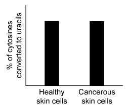-Treating DNA with the compound bisulfite converts any unmethylated cytosines into uracils. Bisulfite sequencing, which takes advantage of this mechanism, was used to compare DNA methylation of the MAGE-A1 gene in healthy cells and melanoma cells. Based on the passage, which of the following graphs most likely represents the percentage of cytosines converted to uracils in the MAGE-A1 gene after treating DNA from these cells with bisulfite?