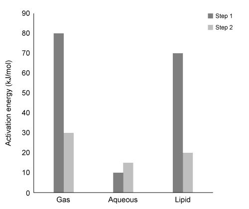 Figure 1 Calculated activation energies for each step of the studied reactions in three environmentsTable 1 Calculated Thermochemical Properties of the Studied Reactions (298.15 K)