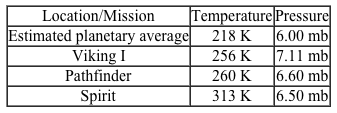 Figure 1 Phase diagram for waterIn the liquid phase, water dissolves and transports molecules, and aids in the biochemical reactions necessary to support life. For this reason, scientists believe liquid-phase water is essential to the existence of extraterrestrial life. Although it has been known for some time that water is present in both the gas and ice phases on Mars, the question remains as to whether there are regions where liquid-phase water can stably exist. Estimates of Mars' surface temperature and pressure generated from satellite readings and global climate models, as well as observations made by Mars rovers, reveal that surface conditions on the planet can vary greatly.Table 1 Temperature and Pressure of Various Locations on Mars