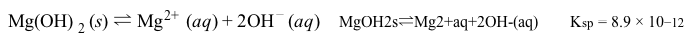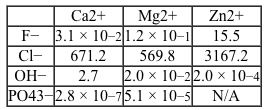 Reaction 2 Solubility equilibrium of Mg(OH) 2 in water at 25°CAlthough passivation slows down the corrosion rate, it must be slowed even further to adequately facilitate bone reformation.Researchers are interested in the differences in the corrosion rates of magnesium metal protected by different biocompatible coatings. They compared 10-mm magnesium disks coated with compounds of various cation and anion combinations, with solubility results shown in Table 1. The coated disks were immersed in simulated body fluid (SBF) at room temperature for 50 hours.Table 1 Solubility for Biocompatible Inorganic Salts Given in mmol/100mL of Pure Water at 25°C