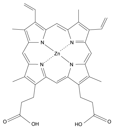 -The figure below shows Zn2+ in place of Fe2+ to form ZPP, which cannot bind to His F8 or O2. Based on the structure of ZPP, which of the following is the coordination number for Zn2+?