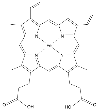 Heme is found in several proteins, including hemoglobin in blood and myoglobin in muscle. It has a four-coordinate iron-bound porphyrin structure where ferrous iron (Fe2+) is bound to four nitrogen atoms through coordinate covalent bonds. The most common heme found in the body is heme b in hemoglobin (Figure 1) .