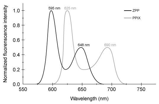 Adapted from Hennig G, Gruber C, Vogeser M, et al. Dual-wavelength excitation for fluorescence-based quantification of zinc protoporphyrin IX and protoporphyrin IX in whole blood. J Biophotonics. 2014;7(7) :514-24.