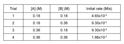 A reaction was performed in which compounds A and B were combined to form compound C. The table below shows an analysis of the kinetics for the reaction with changing reagent concentration.
