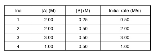 A combination reaction was performed as described by the reaction:A + 2B → 2CAnalysis of the kinetics for the reaction found that the reaction progress responded to changes in reagent concentration as given in the following table: