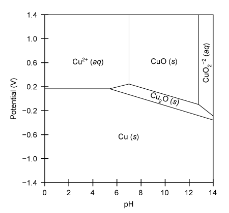 Copper plays a vital role as a trace mineral for biological processes, including the electron transport chain and collagen synthesis. The Pourbaix diagram below outlines the relationship between several copper species as a function of solution pH and applied potential. Which statement accurately describes the chemical changes shown in this diagram?