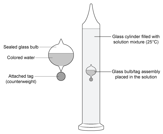 A Galileo thermometer consists of a cylinder filled with a known solution and several sealed glass bulbs partially filled with water. Each bulb effectively acts as an isolated system. If one of the bulbs has the same density as the solution at 25 °C, how will its position and the density of the solution change as the temperature of the solution decreases from 25 °C to 20 °C?