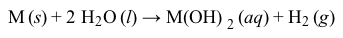 Except for beryllium, the alkaline-earth metals react with water to produce very basic metal hydroxide solutions and hydrogen gas (Reaction 3) .