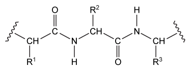 Figure 1 Peptide bonds within a protein segment (Note: Rn = amino acid side chains) Protein chain folding is guided by multiple intramolecular interactions that can occur between two peptide bonds, between a peptide bond and a side chain, or between two side chains, as shown in the protein in Figure 2. Although these interactions are intramolecular because they are within the same molecule, they act effectively like intermolecular interactions because proteins are such large molecules.
