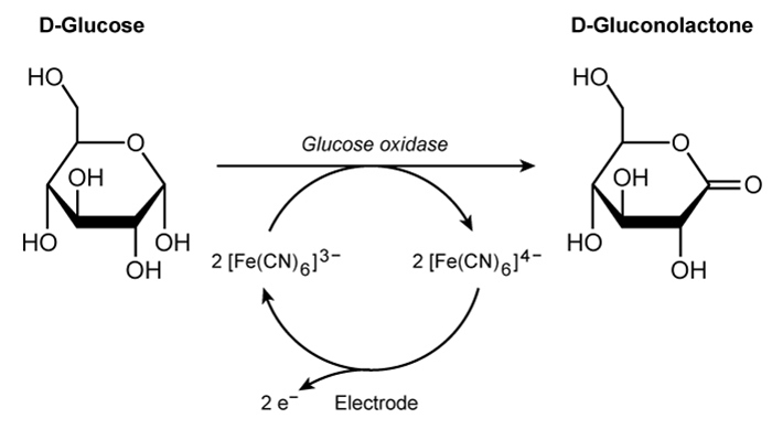 Some test strips for blood glucose meters utilize [Fe(CN) 6]3− as an electron transport mediator for the indirect electrochemical detection of the two-electron oxidation of D-glucose into D-gluconolactone, as shown in the figure below.