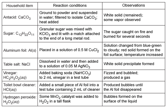 Students were asked to bring items from home to serve as examples for different types of reactions. The instructor provided additional reactants, solvents, heat, or a catalyst to demonstrate reactions with the household items.The students brought aluminum foil, table salt, sugar, baking soda, vinegar, toilet bowl cleaner, hydrogen peroxide, and antacid tablets.Experiment 1Reactions were performed using the household items. The reaction conditions and student observations are recorded in Table 1.Table 1 Reaction Conditions and Visual Observations