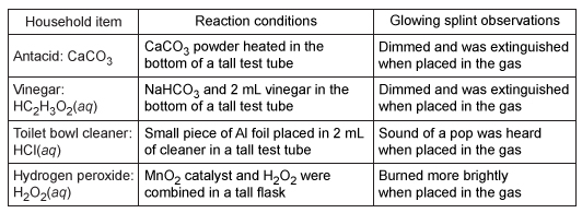 Experiment 2The reactions that were observed to produce gas bubbles in Experiment 1 were repeated, and samples of the gases produced were collected. Each gas sample was tested by holding a burning (glowing) wooden splint within the reaction vessel to determine if the reaction evolved O2, H2, or CO2. A glowing splint placed in O2 will burn more brightly, one placed in H2 will ignite the gas, and one placed in CO2 will be extinguished. The results of the gas tests are recorded in Table 2.Table 2 Glowing Splint Gas Test Observations