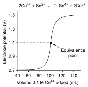 The graph below shows the redox titration curve of a 0.05 M Sn2+ solution titrated with 0.1 M Ce4+.