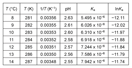 Students conducted an experiment to determine the changes in enthalpy ΔH°, entropy ΔS°, and Gibbs free energy ΔG° resulting from the dissociation of acetic acid (CH3COOH) in water. The students first determined the acid dissociation constant Ka for the reaction by measuring the pH of a 1 M acetic acid solution at various temperatures over a narrow range of less than 10 °C.To perform the pH measurements, the acetic acid solution was initially cooled to 0 °C using an ice bath and then warmed with gentle heating to room temperature with continuous stirring. The pH was recorded at intervals of 1 °C. From the pH data, the value of Ka at each temperature T was calculated. The experimental results over the selected temperature range are shown in Table 1.Table 1 Student Data for the pH and Ka of Acetic Acid with Increasing Temperature