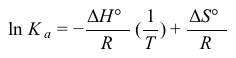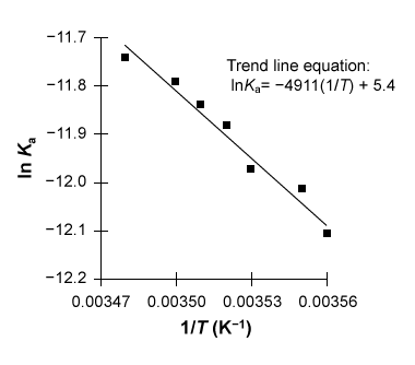 Figure 1 Linear van 't Hoff plot relating the dissociation constant Ka of acetic acid to temperature TThe relationship between Ka, T, ΔH°, and ΔS° in the van 't Hoff plot was then described using a linear fit of the data following the form of Equation 1, in which R is the gas constant (8.3 J∙mol−1∙K−1) .