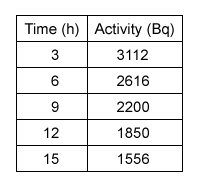 A sample of potassium-42 was measured to have the radioactivity shown in the table below.