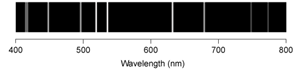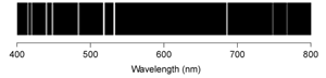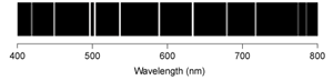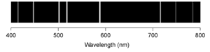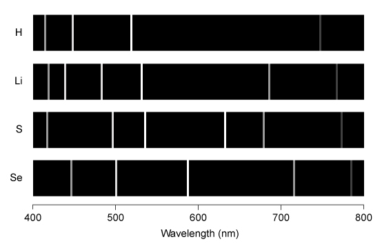 The emission line spectra of hydrogen, lithium, sulfur, and selenium for the visible region of the spectrum are shown below.