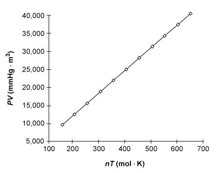 The product of pressure P and volume V of an ideal gas is directly proportional to the product of the moles n and absolute temperature T of the gas, as shown below.