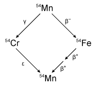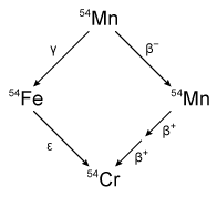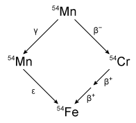 Manganese-54 can undergo a β− decay that is followed by two positron emissions (β+ decays) , or it can undergo a gamma decay (γ) that is followed by electron capture ε (a form of β+ decay) . Which of the following diagrams correctly describes the nuclear decay chain of 54Mn?