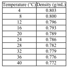 The density of ethanol varies slightly with temperature, as shown in the table below.