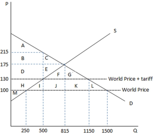 According to the graph shown,the change in producer surplus brought about by the imposition of the tariff is: