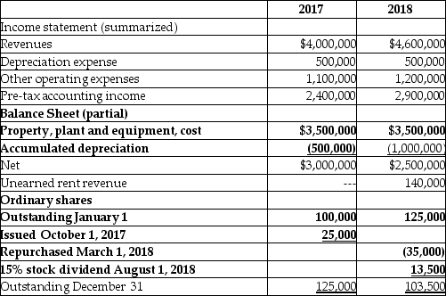 ZEA has a tax rate of 30% in 2017 and 35% in 2018,enacted in February each year.The unearned rent revenue represents cash received from a tenant that will be moving into the building February 15,2019.For tax purposes,any cash received for future rent is taxed when the cash is received.On July 1,2018 the company was fined $20,000 (included in other operating expenses)for violating a building code,this fine is not tax deductible.ZEA claimed CCA for tax purposes of $600,000 in 2017 and $700,000 in 2018.