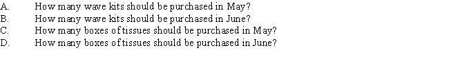 Chatters Salons anticipates giving 104 permanents in May,140 in June,and 130 in July.Chatters needs one permanent wave kit for each perm,along with two boxes of wave tissues.Its inventory policy is to have 10% of the following month's materials needs on hand.On May 1,there were 18 wave kits and five boxes of wave tissues on hand.(Round any fractions of a unit to the nearest whole unit.)