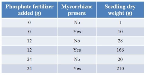 Refer to the table.Researchers grew seedlings with phosphate fertilizer, arbuscular mycorrhizae, or both, and then weighed the seedlings after six months.