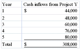 Montana Company is evaluating two different capital investments, Project X and Y. Either X or Y would cost $210,000, and the company cannot afford to do both. The company expects that Project X would provide net cash inflows of $62,000 per year for 5 years. For Project Y, the net cash inflows are expected to be as follows: